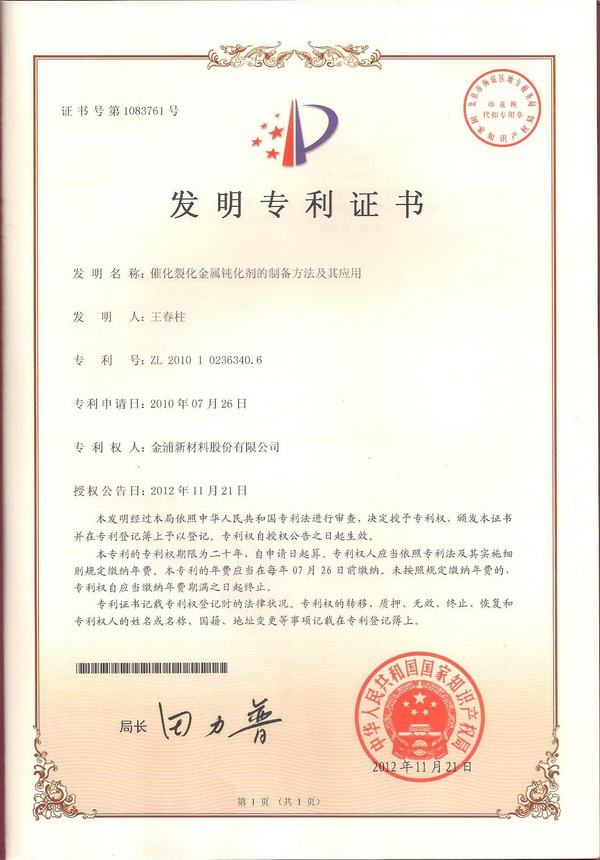 金浦新材料公司在注重对新研发产品技术知识保护的同时,进一步加强推进核心产品新工艺、新技术的应用研究与知识产权保护工作,2012年度有两项新研发产品的工艺技术申请发明专利通过授理审查,同时有四项发明专利《一种柴油脱色精制剂》(申请号为200910264313.7)、《一种乙烯裂解抑焦剂》(申请号为200910264192.6)、《催化裂化金属钝化剂的制备方法及其应用》(申请号为201010236340.6)和《多元复配油溶性破乳剂》(申请号为200910036090.9)获得国家知识产权局发明专利授权证书。目前本公司发明专利申请量达19项,已授权发明专利授权10项。